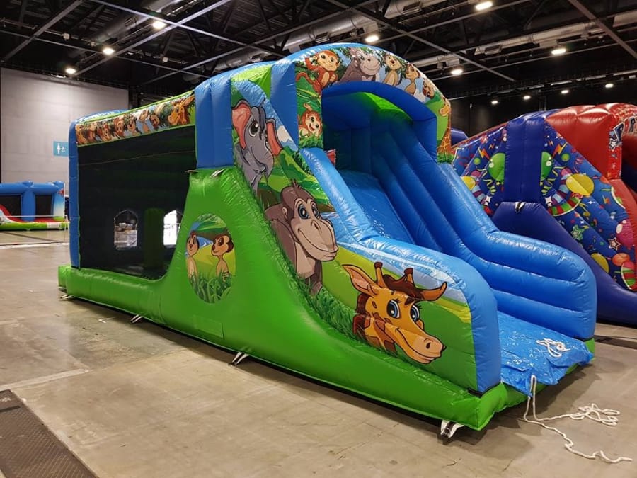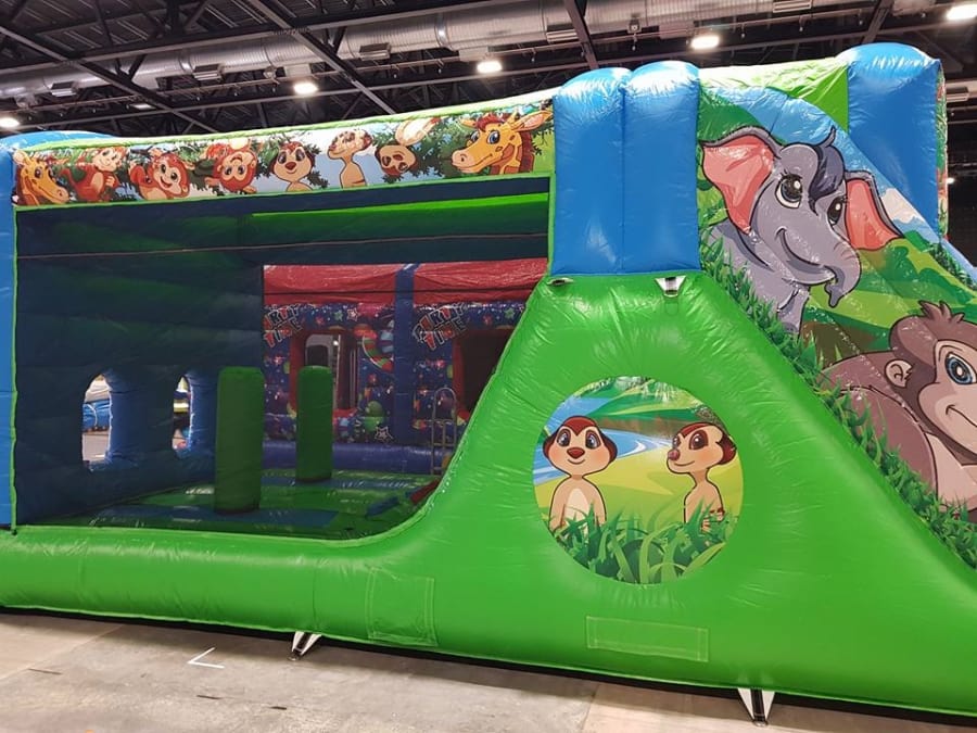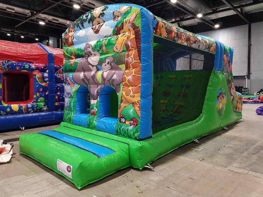 Transform any event into an unforgettable adventure with our Jungle Fun Run – an exhilarating jungle themed assault course designed to captivate participants of all ages! Imagine the thrill of maneuvering through a vibrant jungle setting, racing against friends or family in a battle of agility and speed. This inflatable masterpiece features two competitive lanes and a thrilling 6ft platform slide that promises endless fun.