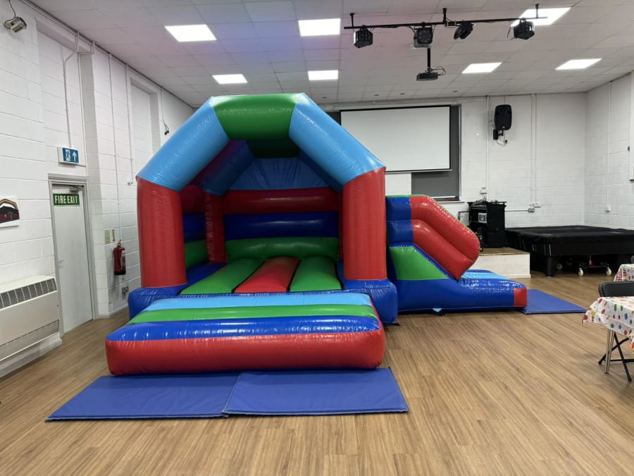 14ft x 18ft multi coloured gloss bouncy castle with slide